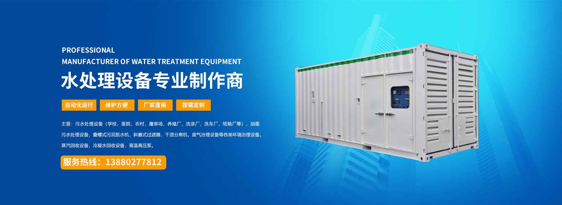 四川宇藍環(huán)保工程有限公司是水處理設備及各類環(huán)境治理設備的生產廠家并承接各類環(huán)境治理設備的工程項目。 公司專門從事各類環(huán)境治理設備及冷凝水蒸汽回收設備的開發(fā)、設計、制造、銷售以及技術服務的綜合性公司,主要產品有:污水處理設備(學校,農村,屠宰場,養(yǎng)殖場,醫(yī)院,小區(qū),紙箱廠,洗滌廠等),油墨污水處理設備,疊螺式污泥脫水機,斜塞式過濾器,干濕分離機,廢氣治理設備等各類環(huán)境治理設備以及蒸汽回收設備,冷凝水回收設備,高溫高壓泵等各類節(jié)能減排的節(jié)能設備。 ...